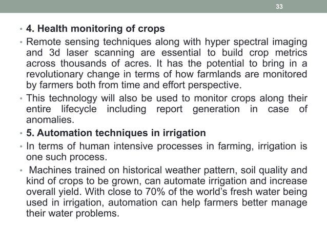 Pippal "Role of Artificial Intelligence in Agriculture: An Analysis and Advancements With Focus on Plant Diseases" IEEE 2023. [2] Robert G. de Luna, Elmer P. Dadios, Argel A. Bandala, "Automated Image Capturing System for Deep Learning-based Tomato Plant Leaf Disease Detection and Recognition," AI Image Analysis: Uses computer vision models to analyze crop images uploaded by farmers and detect signs of diseases. Environmental Data Integration: Considers environmental factors like temperature, humidity, and soil moisture to provide a more accurate disease prediction. Real-Time Alerts: Sends notifications to farmers about potential disease outbreaks in their fields.