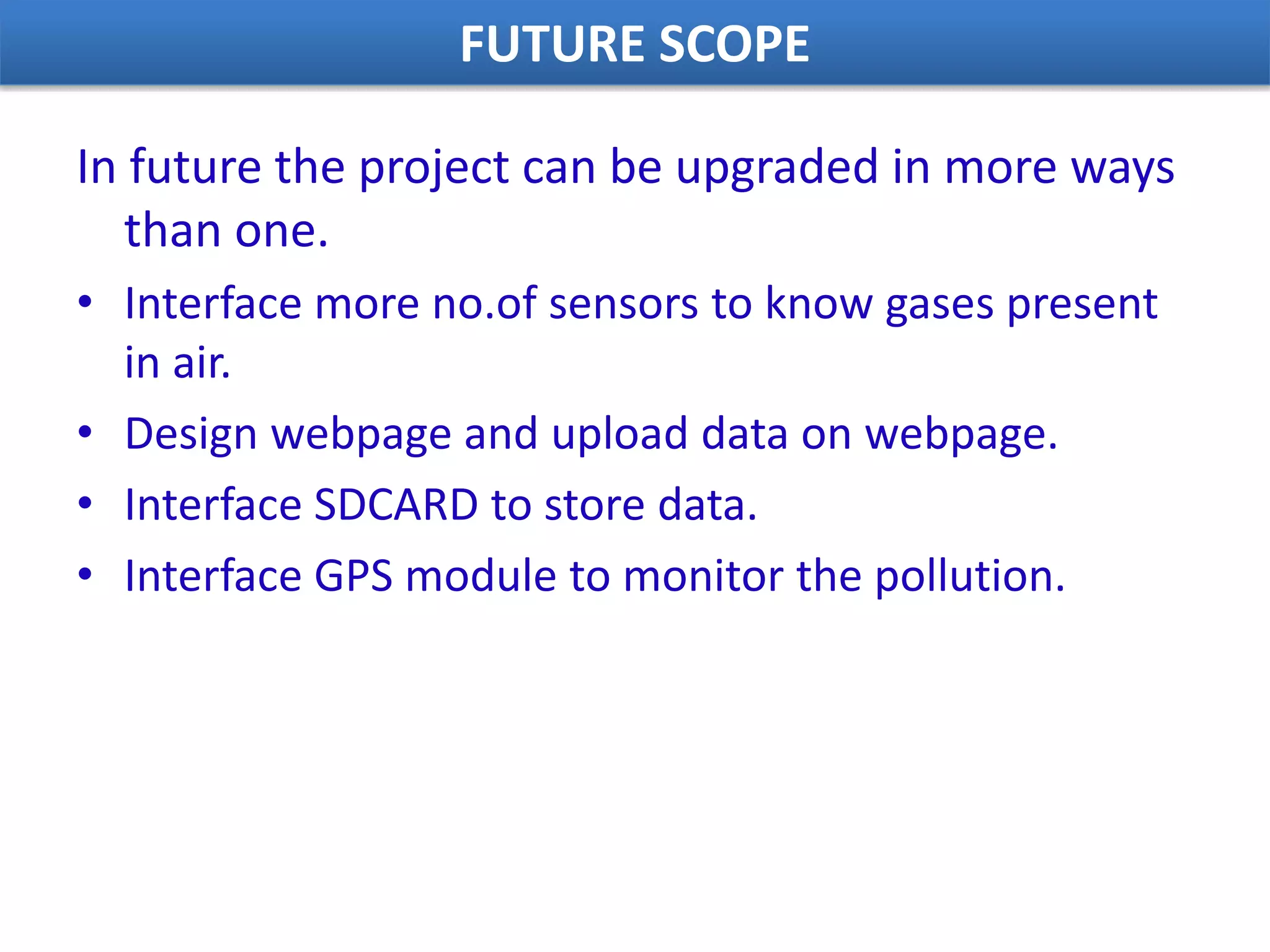 By carefully selecting and integrating these components, you can create a robust and reliable real-time air quality monitoring device. This device will enable you to measure and analyze air quality data, providing valuable insights into the environment and helping to take informed actions to protect health and well-being. In this project we are going to make an IOT Based Air Pollution Monitoring System in which we will monitor the Air Quality over a webserver using internet and will trigger a alarm when the air quality goes down beyond a certain level IoT & Edge AI Project Challenge 2024 World Energy Challenge 2023 India Automation Challenge 2021 An IoT-powered system for real-time air quality monitoring and analysis. This project integrates environmental sensors with a machine learning model to predict and assess air quality indices. Features include data visualization, predictive analytics, and automated alerts for actionable insights.