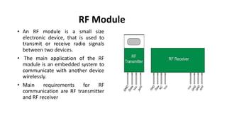In this project, a wireless transmitter and receiver system using RF modules (RF Transmitter and RF Receiver) is implemented. An RF Transmitter and Receiver pair is used for wireless communication. The wireless data transmission is done using 433 MHz Radio Frequency signals that are modulated using Amplitude Shift Keying (ASK) Modulation technique.